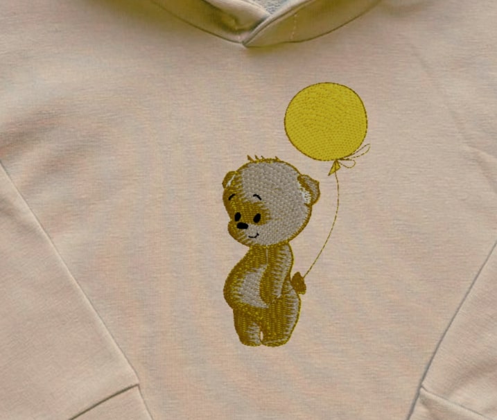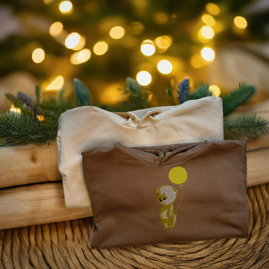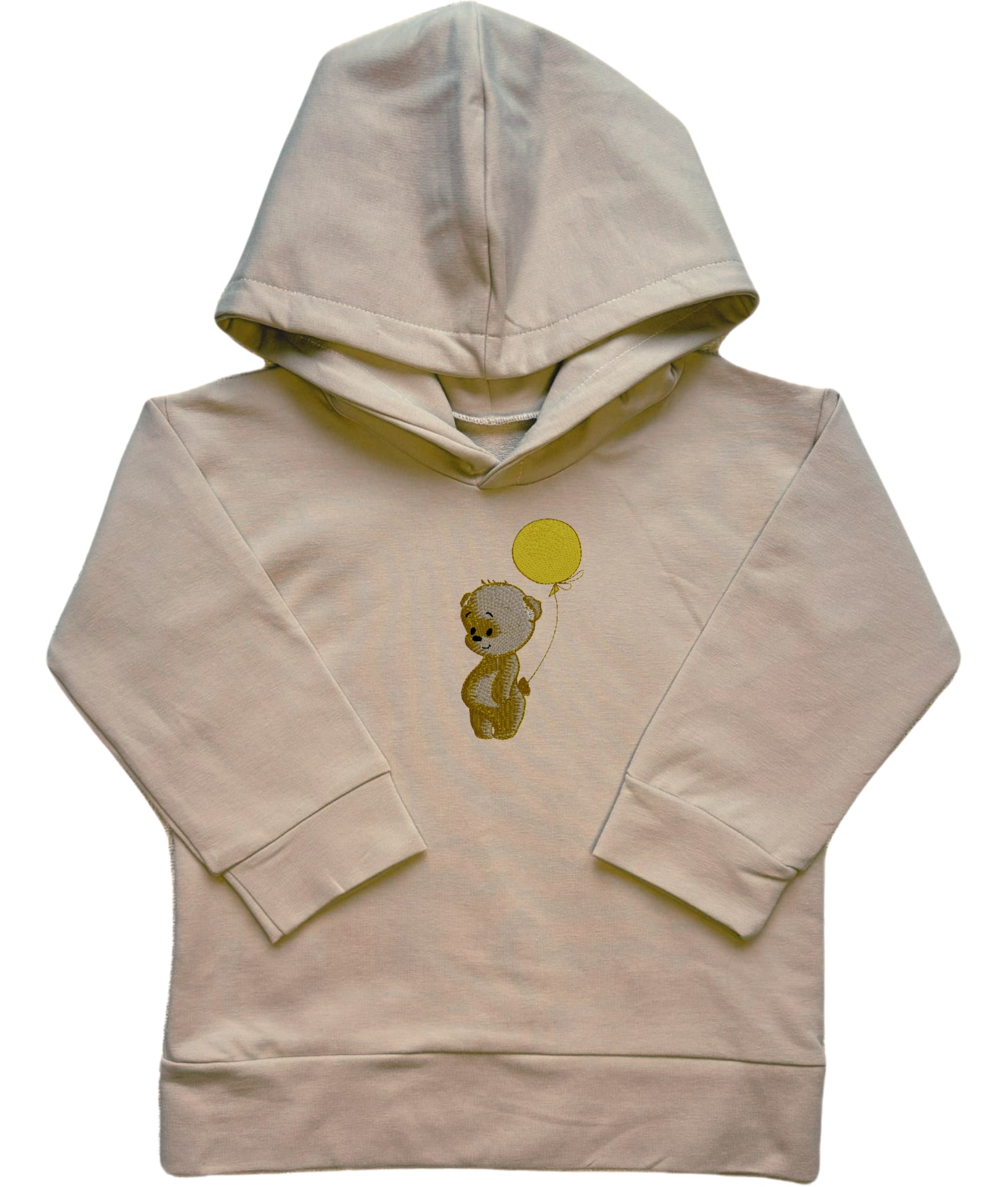 Prezentujemy niezwykle uroczą bluzę dziecięcą w modnym kolorze jasnego beżu. Ozdobiona jest starannie wykonanym haftem z motywem misia trzymającego balonik, co nadaje jej unikalnego charakteru. To nie zwykły nadruk – haft na bluzie gwarantuje trwałość i elegancję na długie lata.