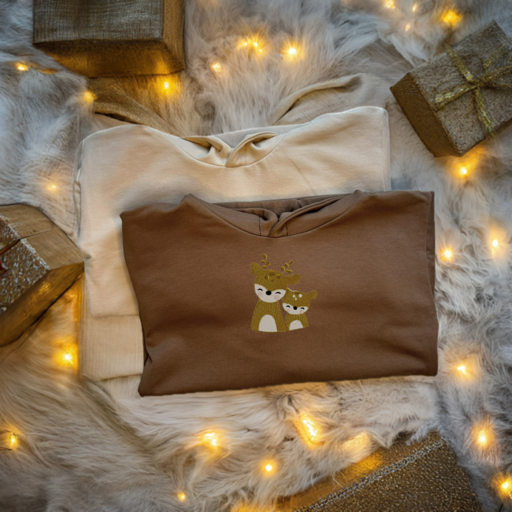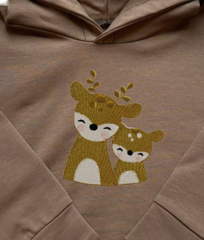 Prezentujemy niezwykle uroczą bluzę dziecięcą w modnym kolorze ciemnego beżu. Ozdobiona jest starannie wykonanym haftem z motywem sarenek, co nadaje jej unikalnego charakteru. To nie zwykły nadruk – haft na bluzie gwarantuje trwałość i elegancję na długie lata.