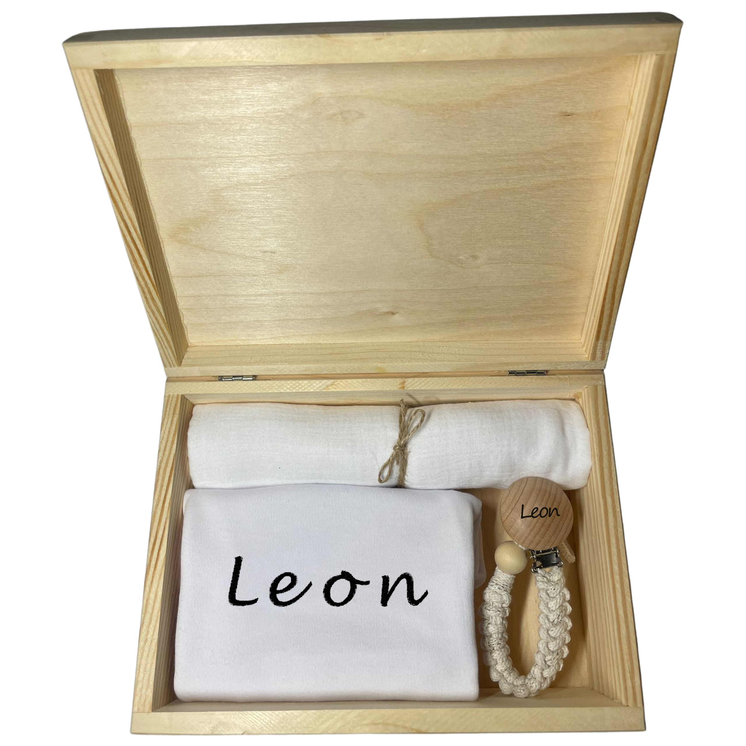✏️Skorzystaj z możliwości personalizacji – wpisz imię dziecka, a my wyhaftujemy je na body niemowlęcym oraz wygrawerujemy je na pudełku i zawieszce.