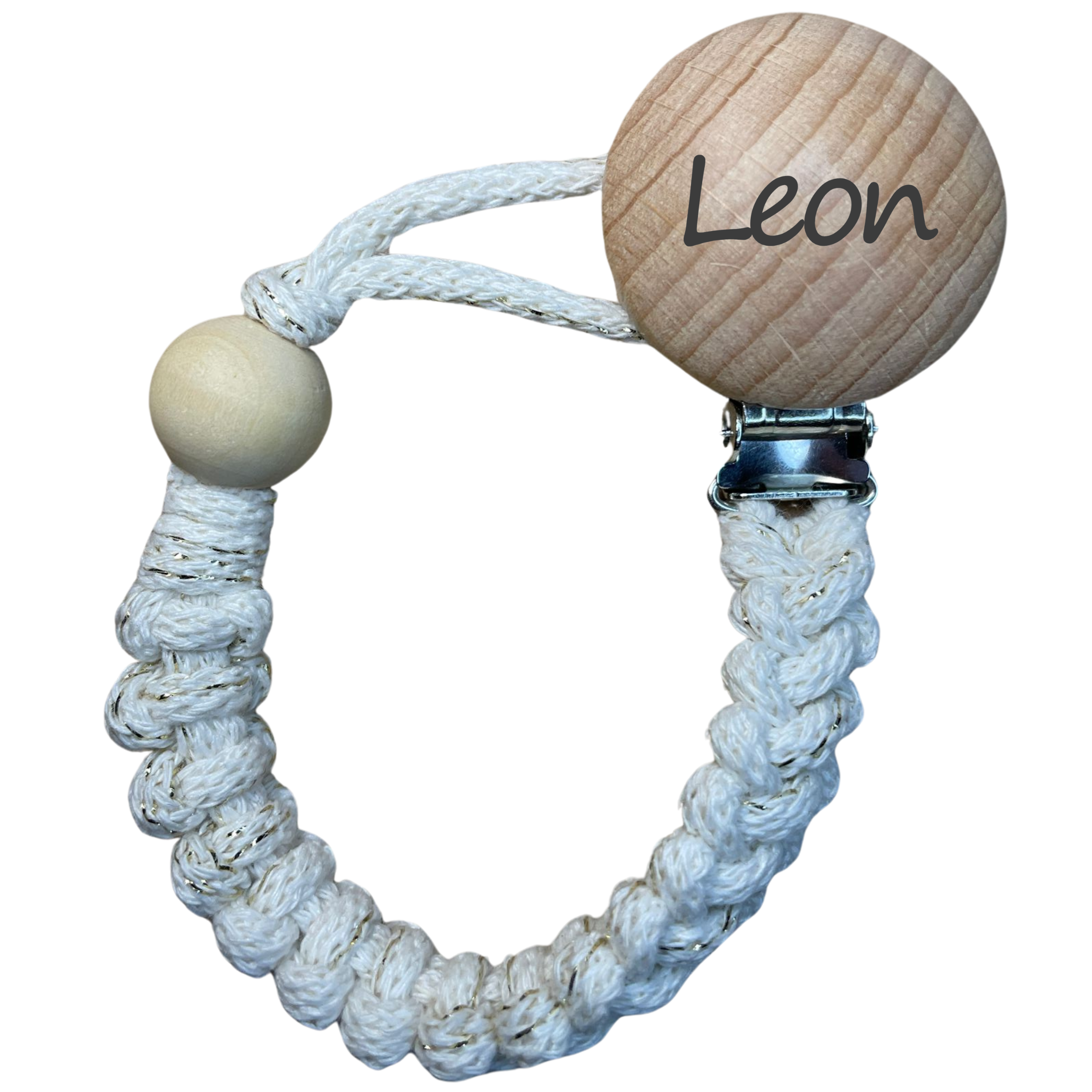 ✔️Pleciona zawieszka do smoczka HANDMADE z wygrawerowanym imieniem dziecka w kolorze białym ze złotą nicią