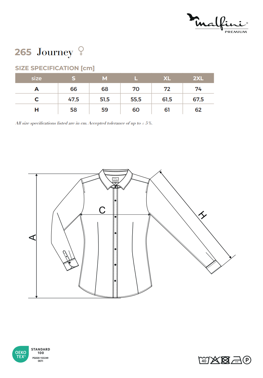 zaprojektowany przez czołowego czeskiego krawca Romana Humlíčka, przędza z bardzo długich włókien, dopasowany krój z bocznymi szwami, podwójny karczek i zaszewki z tyłu, zaszewki w talii z przodu, kołnierzyk koszulowy, części przednie wykończone plisą, długie rękawy z półokrągłym mankietem na 2 guziki, perłowe guziki w kolorze 00 (2 zapasowe guziki), zaokrąglona dolna krawędź