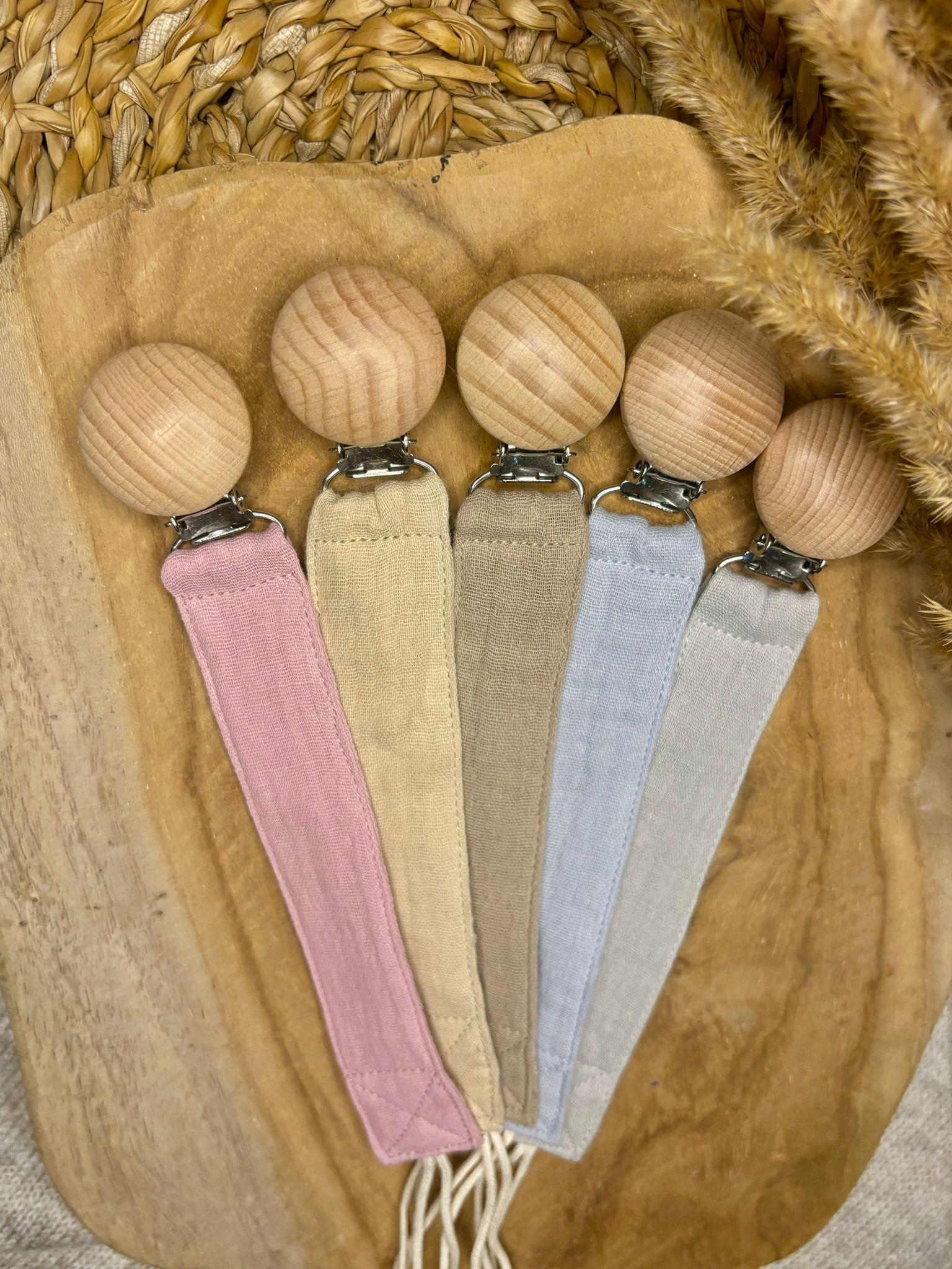 - Bezpieczeństwo i praktyczność – Drewniany klips pewnie trzyma się ubranka, zapobiegając zgubieniu lub zabrudzeniu smoczka.