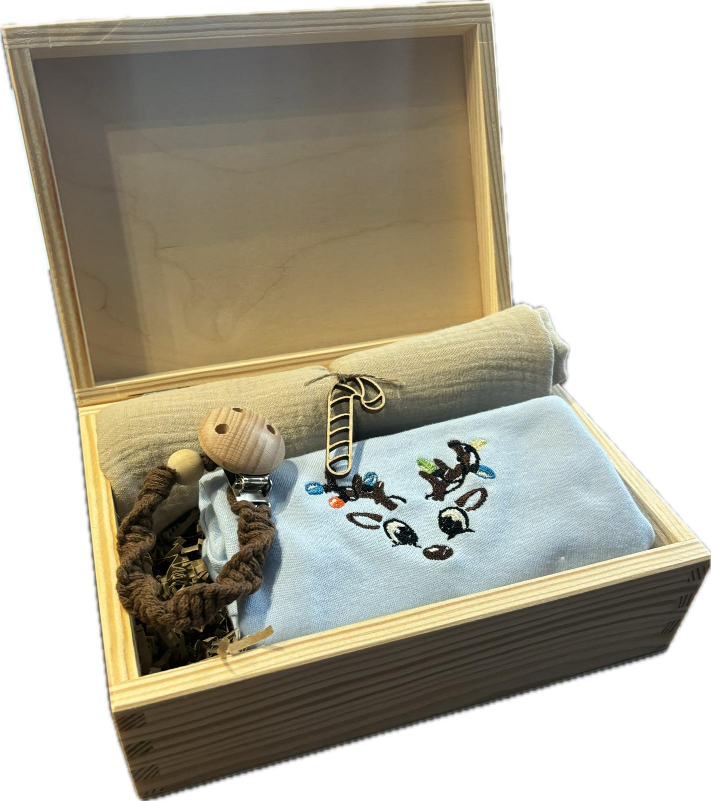 Podaruj prezent, który zachwyci swoją estetyką i praktycznością! Nasz BABY BOX to idealne połączenie personalizacji, trwałości i elegancji. W zestawie znajdziesz wysokiej jakości body z haftem, zawieszkę do smoczka, muślinową pieluszkę i eleganckie drewniane pudełko z personalizacją.