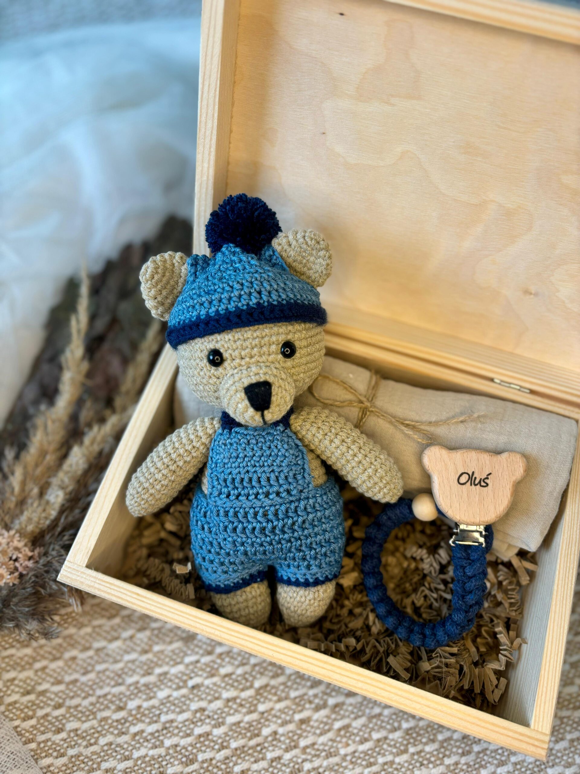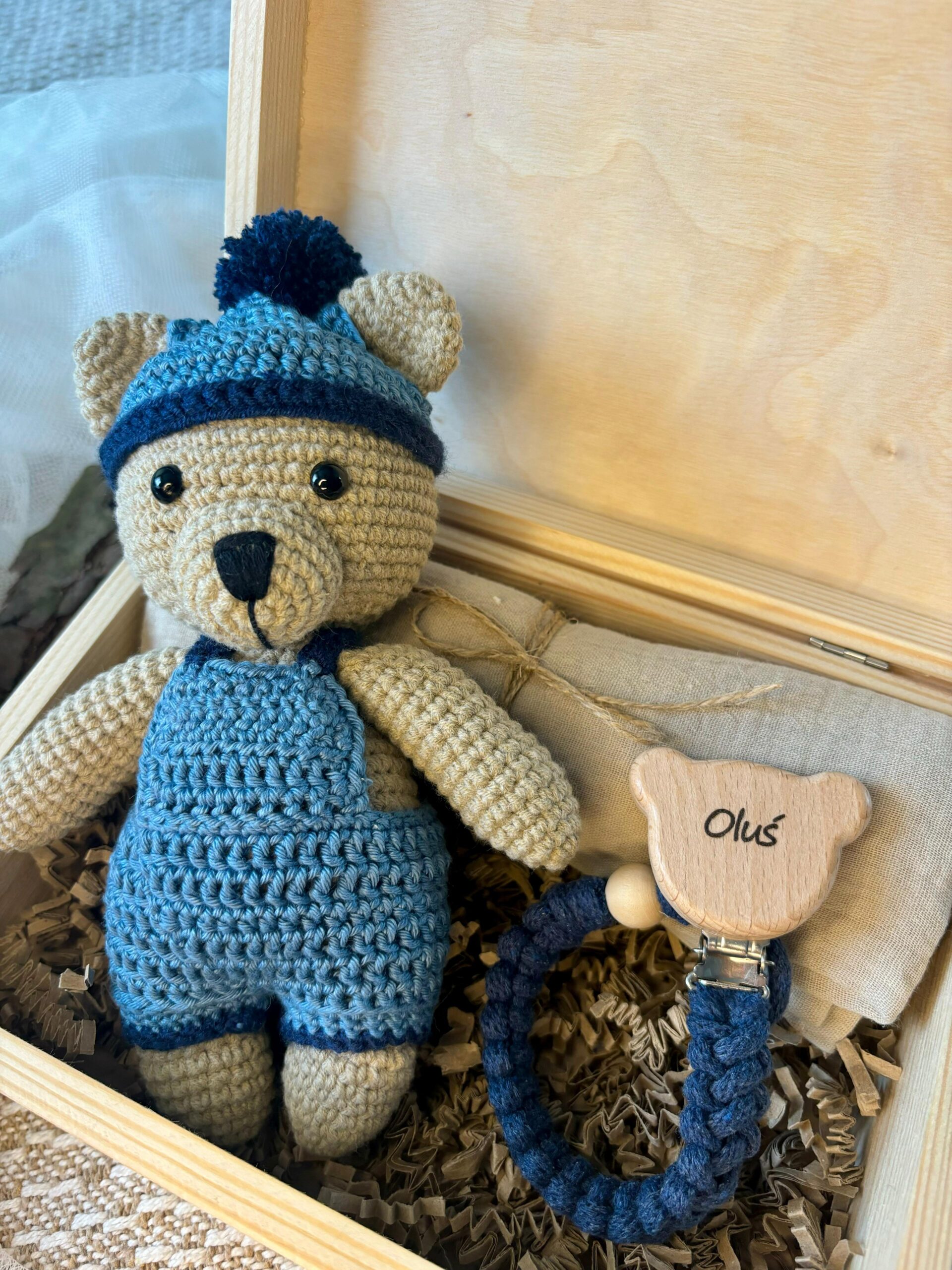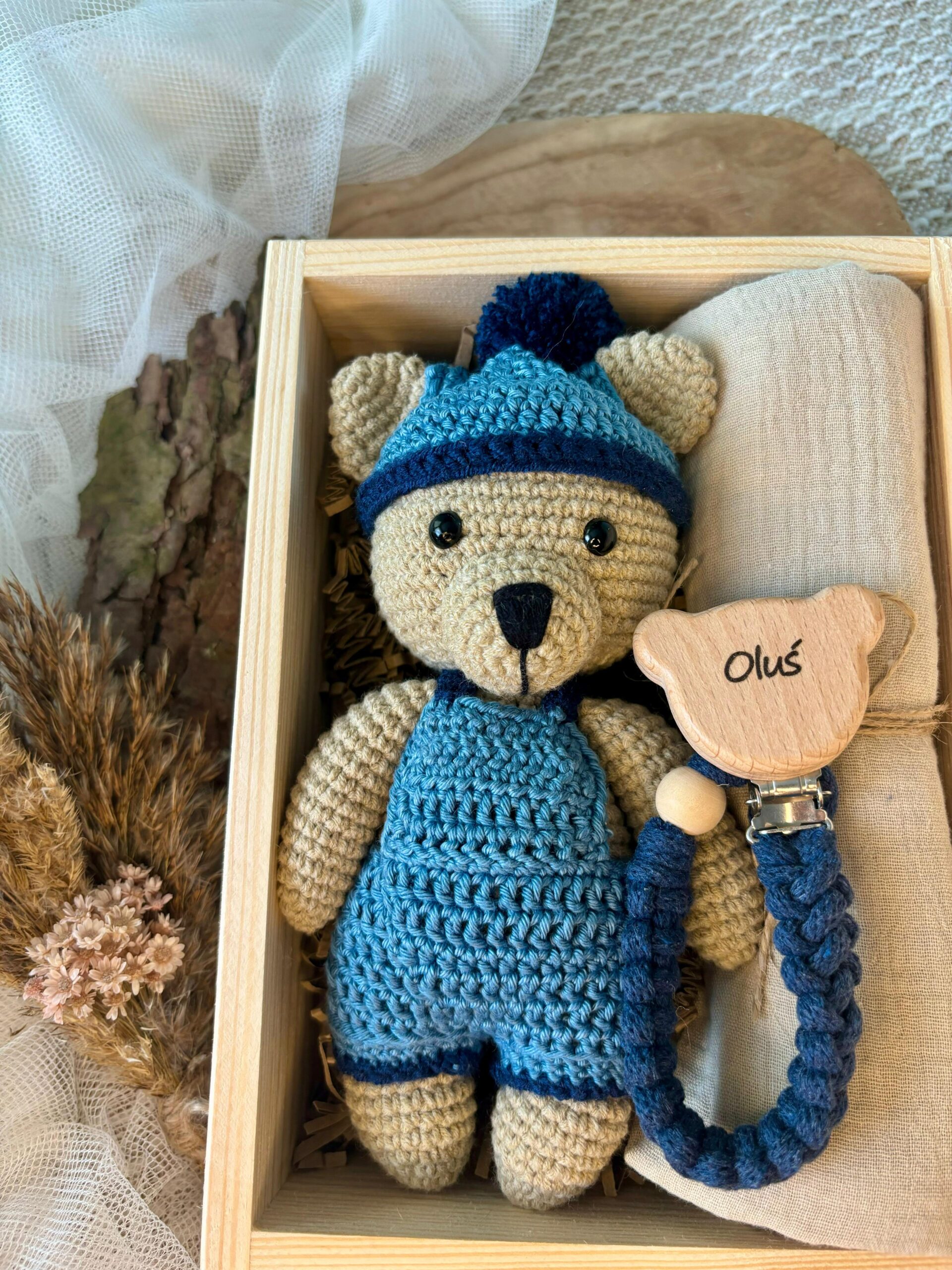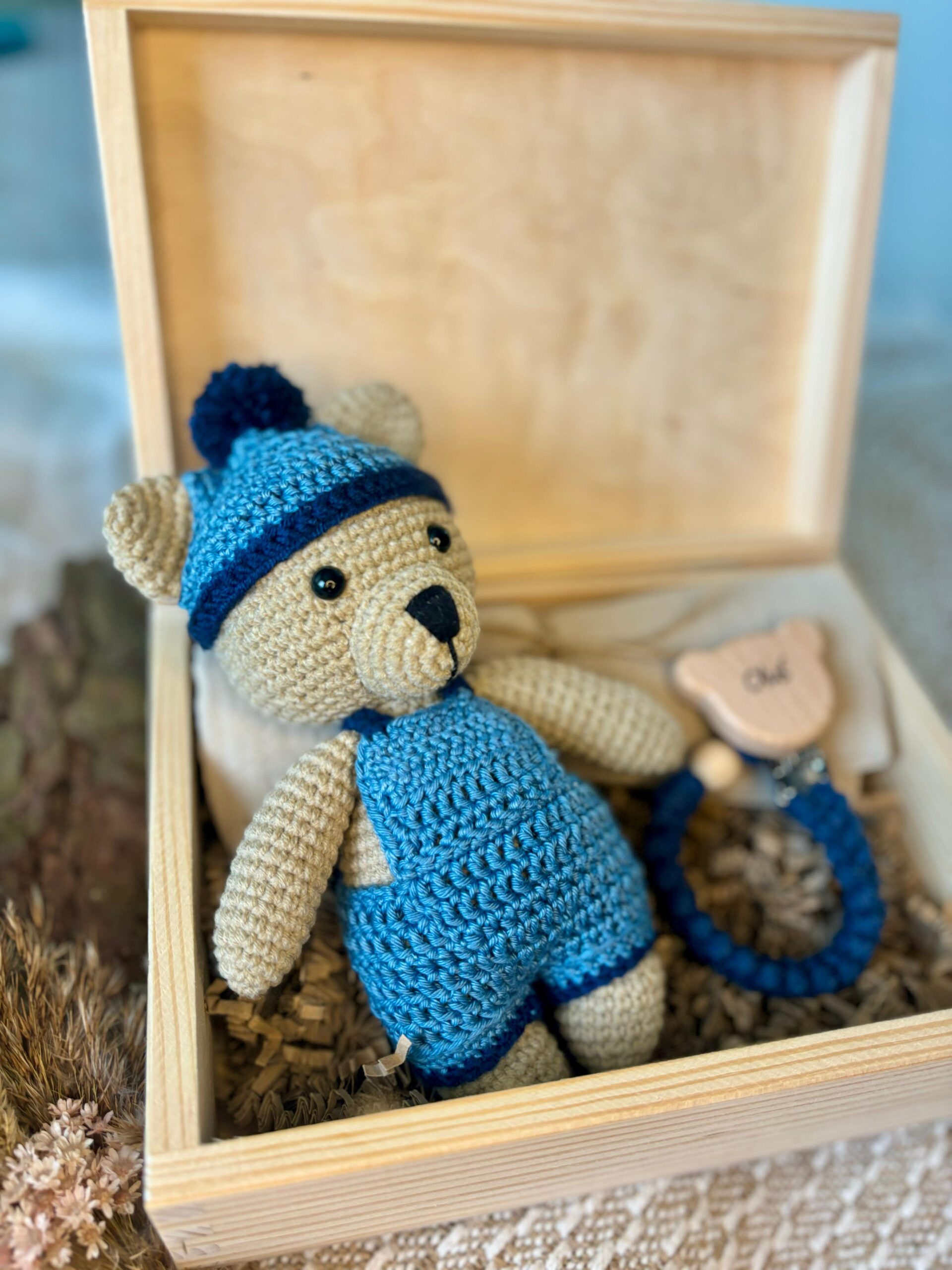 Odkryj wyjątkowy prezent z okazji narodzin – praktyczny prezent z misiem na szydełku, zawieszką do smoczka z imieniem i pieluszką muślinową. Całość zapakowane w drewniane pudełko z wygrawerowanym imieniem dziecka.