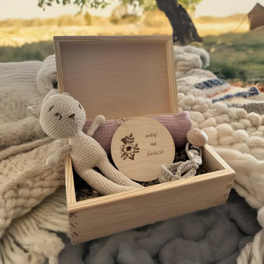Odkryj wyjątkowy prezent z okazji narodzin – praktyczny prezent z misiem na szydełku, zawieszką do smoczka z imieniem i pieluszką muślinową. Całość zapakowane w drewniane pudełko z wygrawerowanym imieniem dziecka.