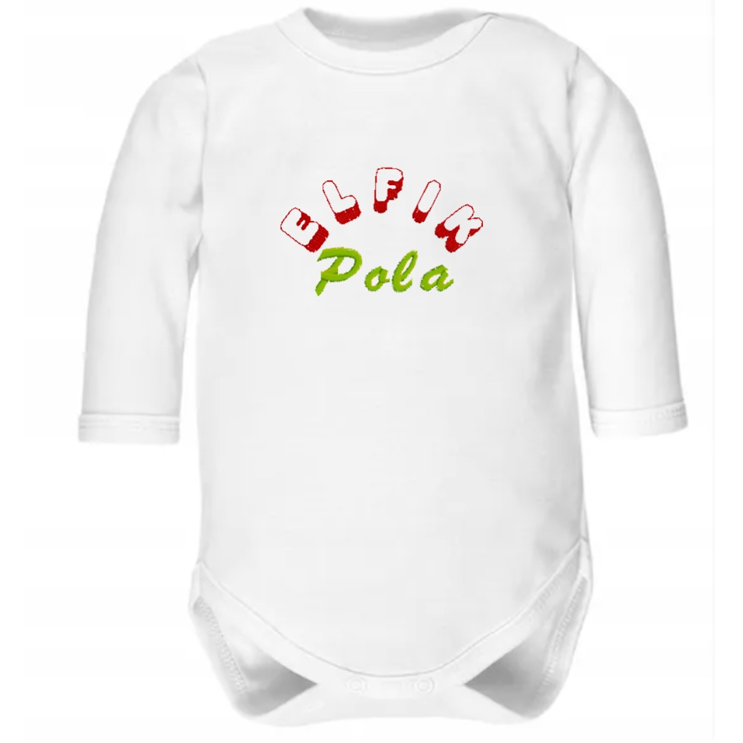 - Body niemowlęce z haftowanym imieniem dziecka, dostępne w rozmiarach 56-92, co pozwala na idealne dopasowanie do maluszka.