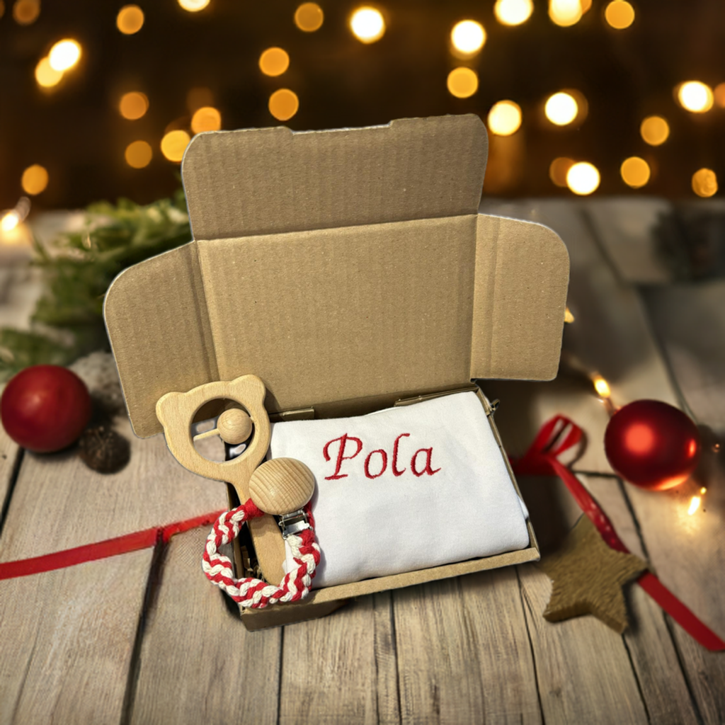 Zestaw świąteczny dla noworodka z body niemowlęcym z wyhaftowanym imieniem, zawieszką do smoczka i drewnianą grzechotką.