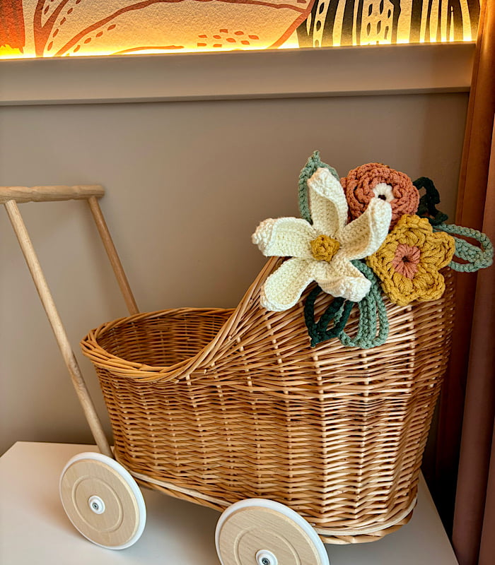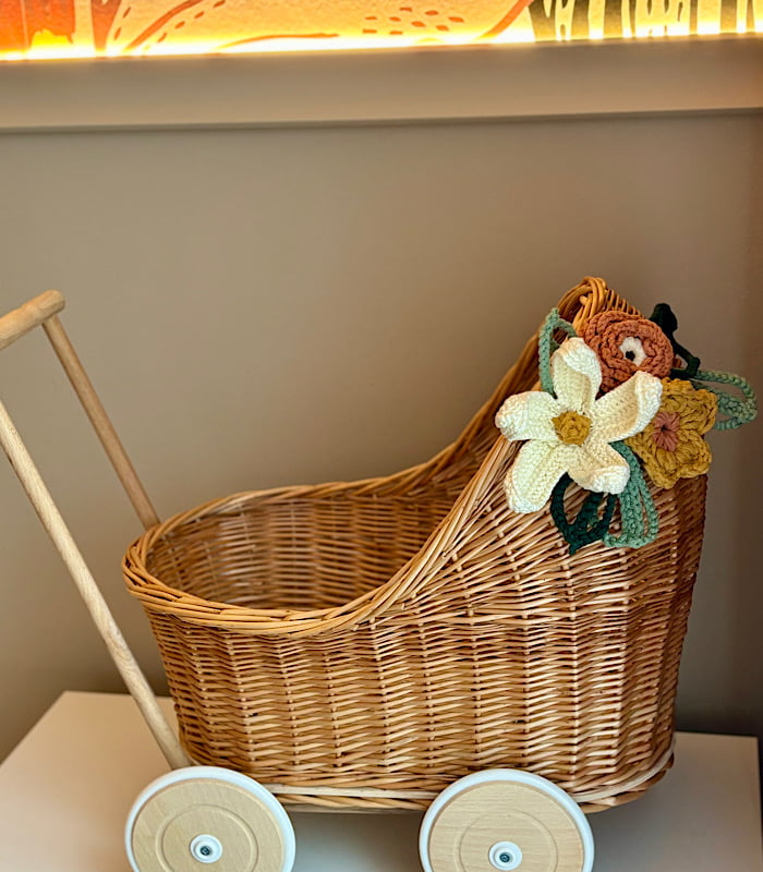 Wykonany z najwyższej jakości wikliny, ten wózek dla lalek jest idealną zabawką dla dziewczynek. Jego naturalny wygląd i ręcznie robione detale sprawiają, że jest to nie tylko zabawka, ale także piękna ozdoba dziecięcego pokoju. Polecany jako pierwszy wózek dla lalek.