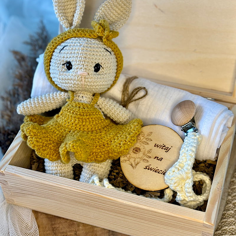 Nasze gotowe zestawy prezentowe zawierają starannie dobrane produkty, takie jak misie ręcznie wykonane, pieluszki muślinowe, body niemowlęce z haftem oraz drewniane grzechotki. Zestawy są pakowane w eleganckie, personalizowane drewniane pudełka.