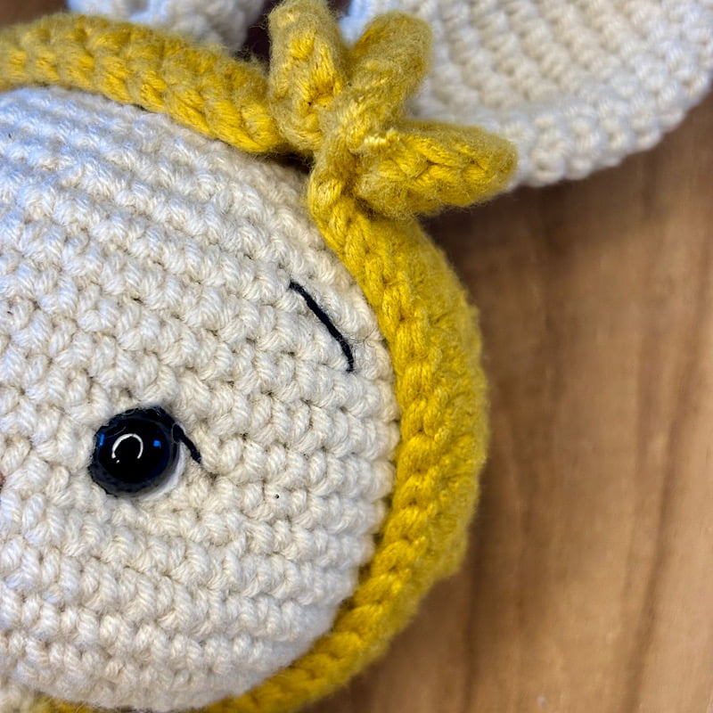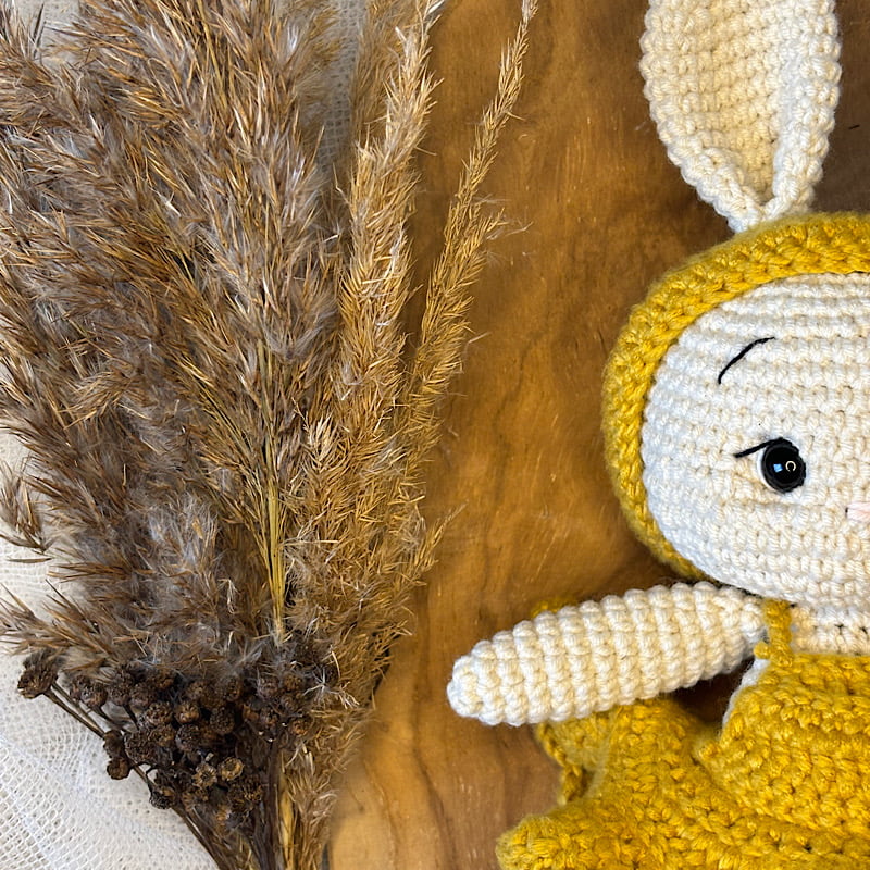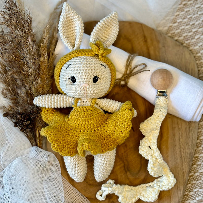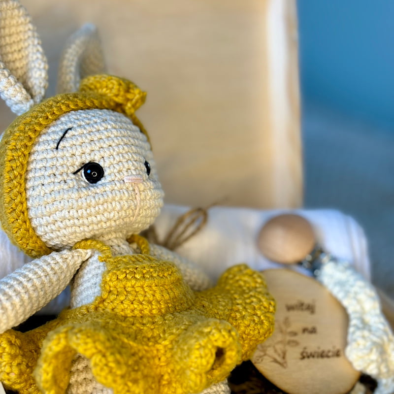 - Ręcznie szydełkowany króliczek dla dziewczynki — wykonany z bezpiecznej, miękkiej włóczki w delikatnym, kremowym odcieniu. Ten uroczy króliczek to nie tylko idealny towarzysz do zabawy, ale również przytulanka, która może stać się pierwszym najlepszym przyjacielem maluszka, dając mu poczucie komfortu i bezpieczeństwa.