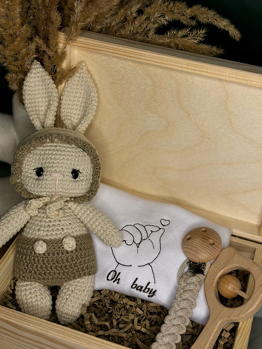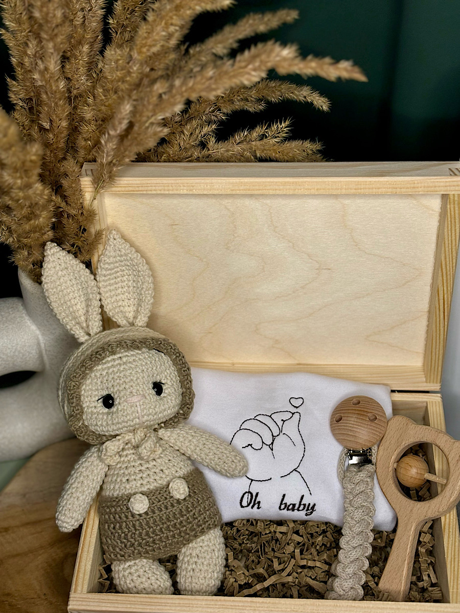 Cały zestaw zostanie starannie umieszczony w pięknym drewnianym pudełku, które będzie ozdobione wygrawerowanym imieniem dziecka. To nie tylko praktyczne opakowanie, ale również niezwykła pamiątka, która będzie przypominać o tych magicznych chwilach przez wiele lat. Zestawione w nim prezenty nabiorą dodatkowego uroku i wartości, tworząc wyjątkową skrzyneczkę pełną miłości i ciepła