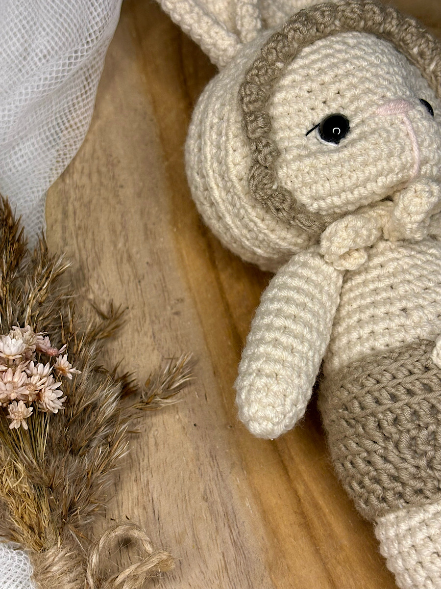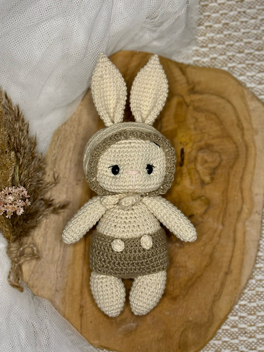 - Ręcznie wykonany króliczek — stworzony z miękkiej i bezpiecznej włóczki w kolorze kremowym. Ten uroczy króliczek to idealny towarzysz do przytulania oraz zabawy, który zapewnia dziecku poczucie bezpieczeństwa i komfortu.