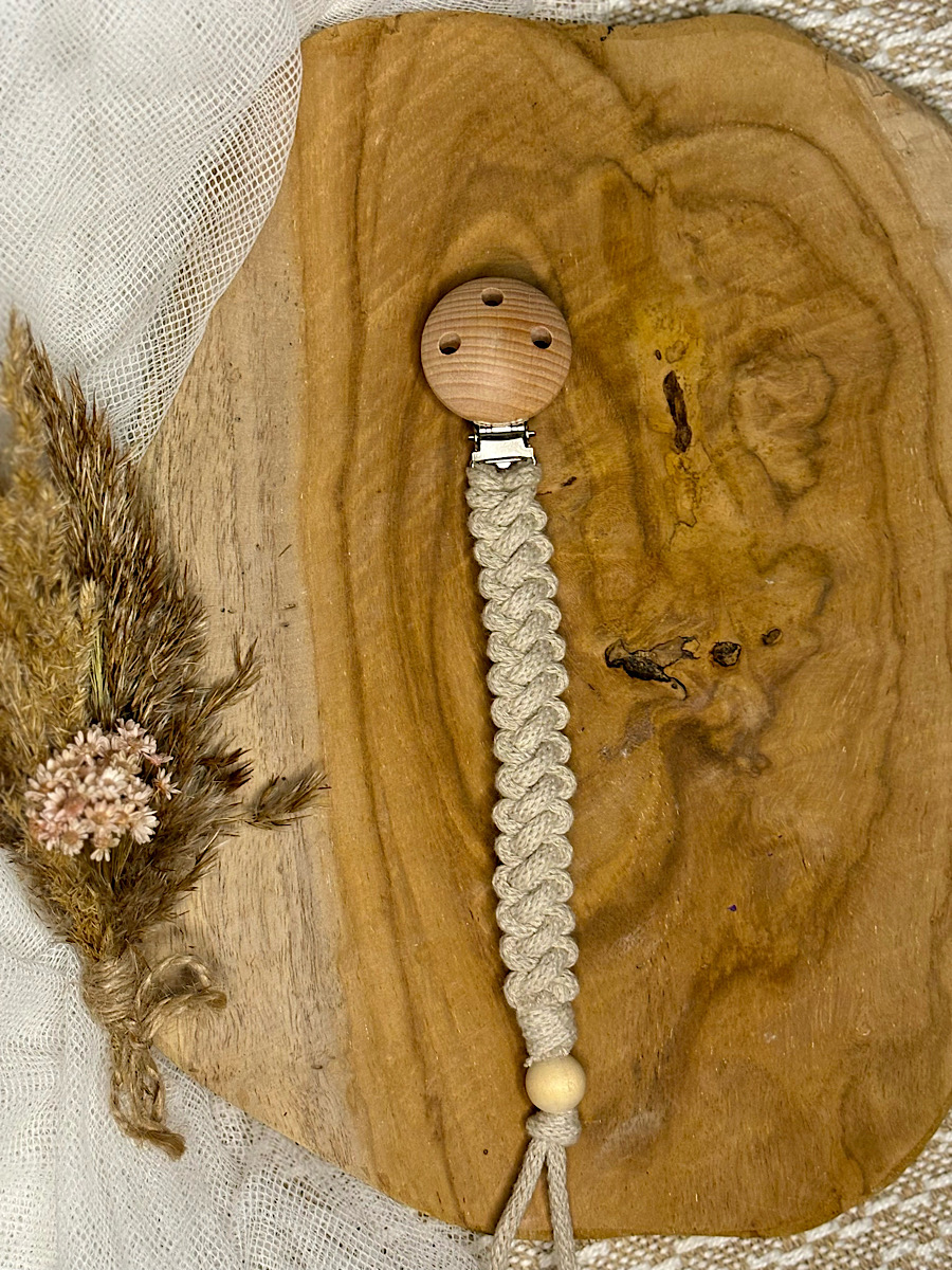 - Zawieszka do smoczka z personalizacją — wykonana z drewnianej zapinki i bawełnianego sznurka. Zawieszka z imieniem dziecka nie tylko dodaje eleganckiego akcentu, ale także pomaga utrzymać smoczek zawsze w zasięgu ręki, unikając jego zgubienia. Wszystkie nasze zawieszki wykonane są zgodnie z normą europejską EN 12586: 2007 (+ A1: 2011).
