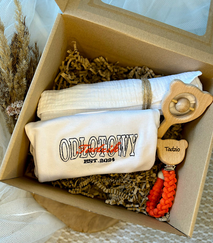 Oferujemy szeroki wybór prezentów dla noworodka, w tym gotowe zestawy prezentowe, drewniane pudełka z wygrawerowanym imieniem, ręcznie wykonane misie, pieluszki muślinowe, zawieszki do smoczka z imieniem, body niemowlęce z haftem (dowolnym napisem lub grafiką), a także drewniane grzechotki.