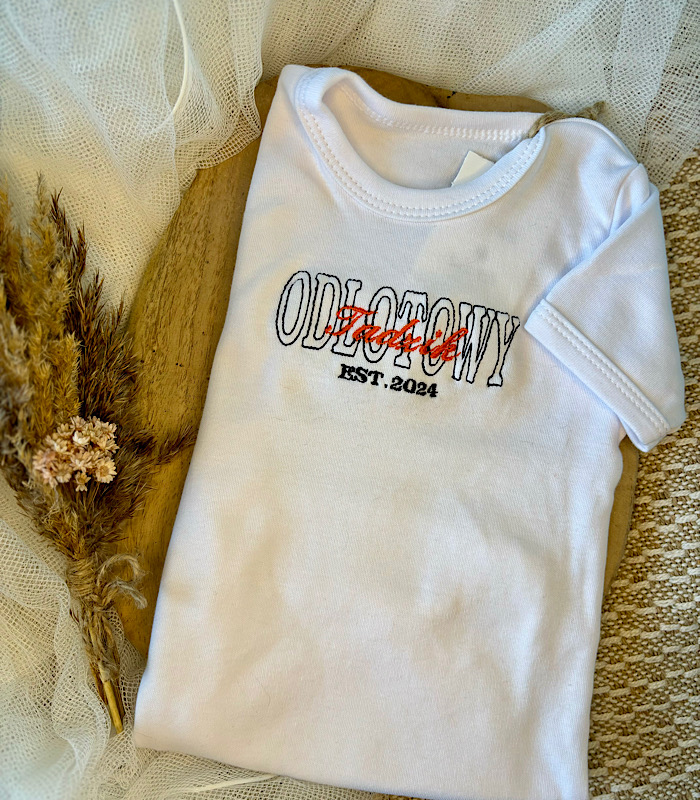 Podaruj maluszkowi wyjątkowy prezent, który z pewnością wywoła uśmiech na twarzy rodziców – body niemowlęce z personalizowanym wyhaftowanym napisem. Wykonane z najwyższej jakości, delikatnej dla skóry bawełny, zapewnia komfort i bezpieczeństwo dla wrażliwej skóry noworodka. Dzięki możliwości dodania własnego haftu, możesz uczynić ten upominek unikalnym i osobistym, dodając imię dziecka, datę urodzenia lub krótki, czuły komunikat. Dodatkowo, istnieje opcja wysłania pliku z dokładnym wyglądem napisu, co sprawia, że prezent staje się jeszcze bardziej wyjątkowy i dopasowany do Twoich oczekiwań. To nie tylko praktyczny, ale i pełen uroku prezent, który stanie się piękną pamiątką na całe życie.